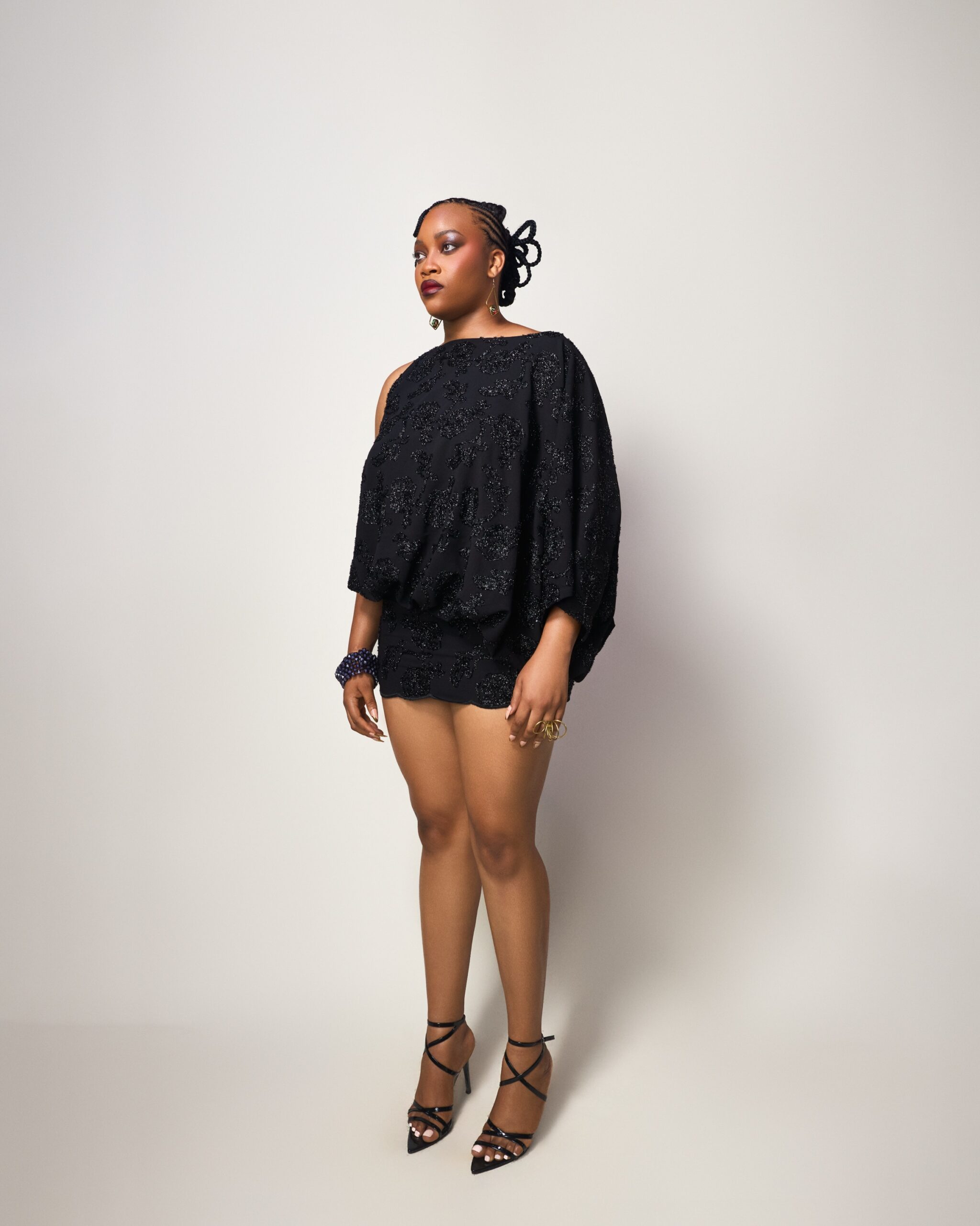 A fluid one-shoulder mini dress crafted in textured black fabric with subtle shimmer. Designed with a voluminous bubble silhouette and soft draping that gathers at the hem for an effortless, sculptural shape.