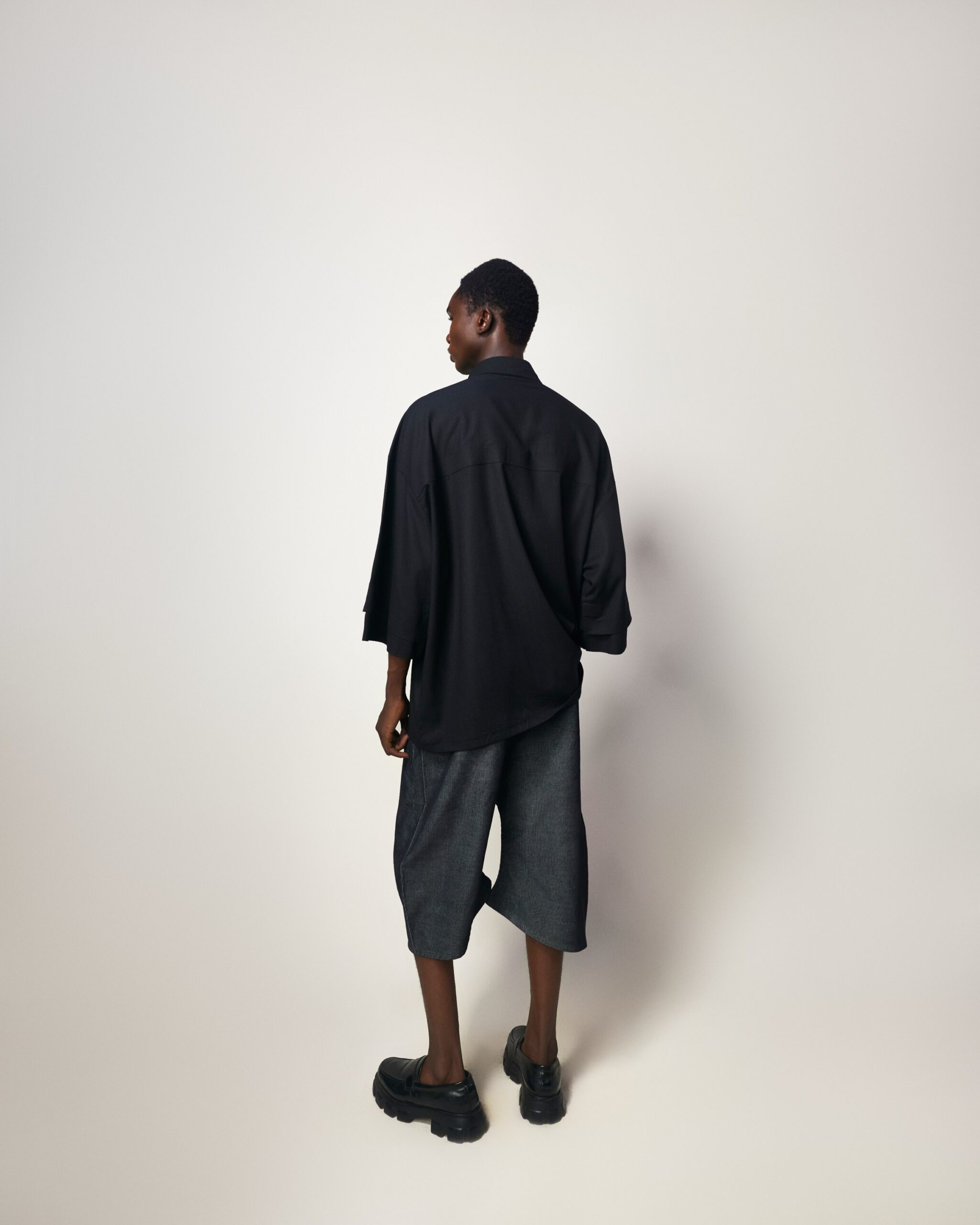 A relaxed button-down shirt designed with a soft drape and a signature double-layered sleeve hem that adds subtle structure and depth. Cut with a wide sleeve, easy body, and understated finish.
