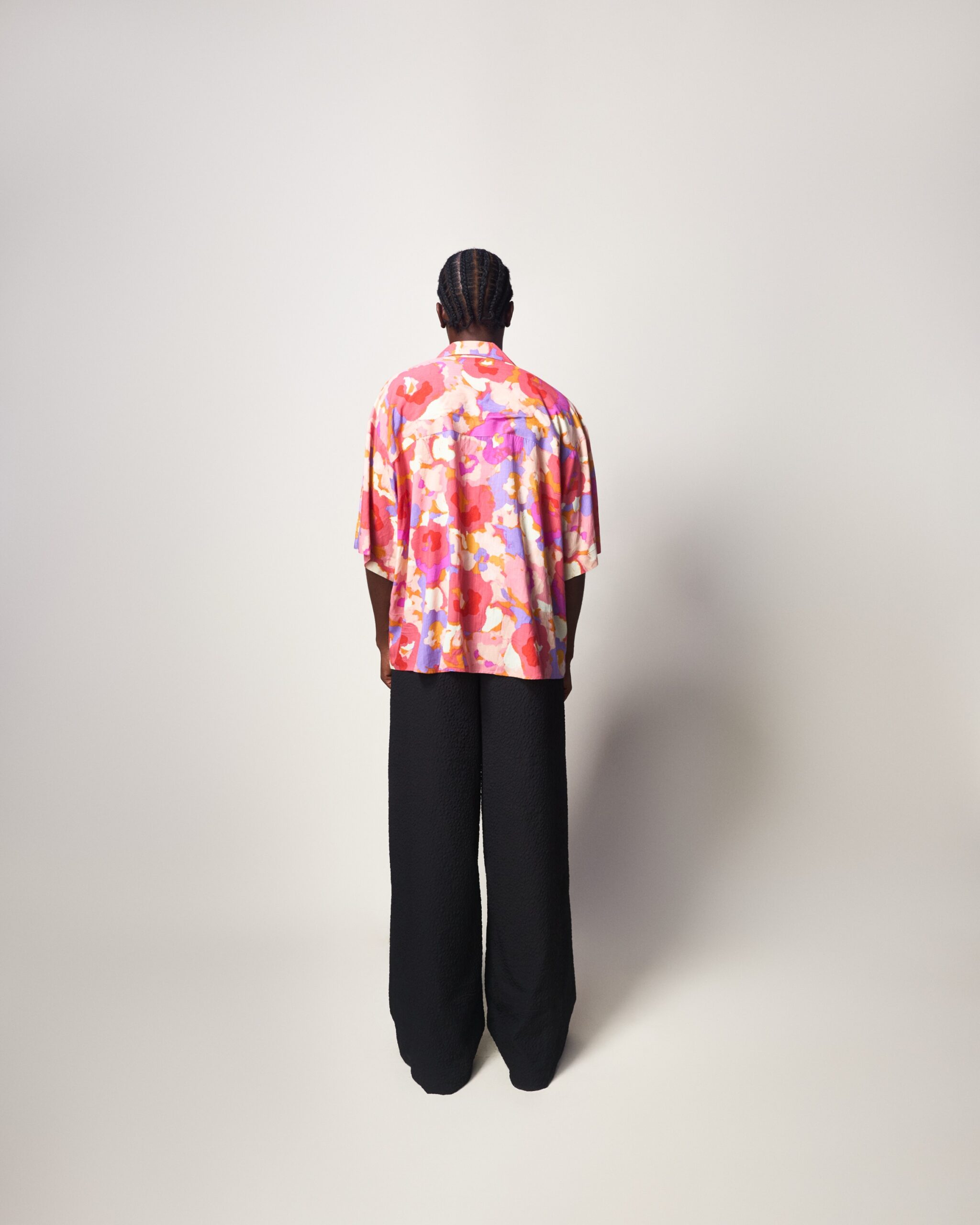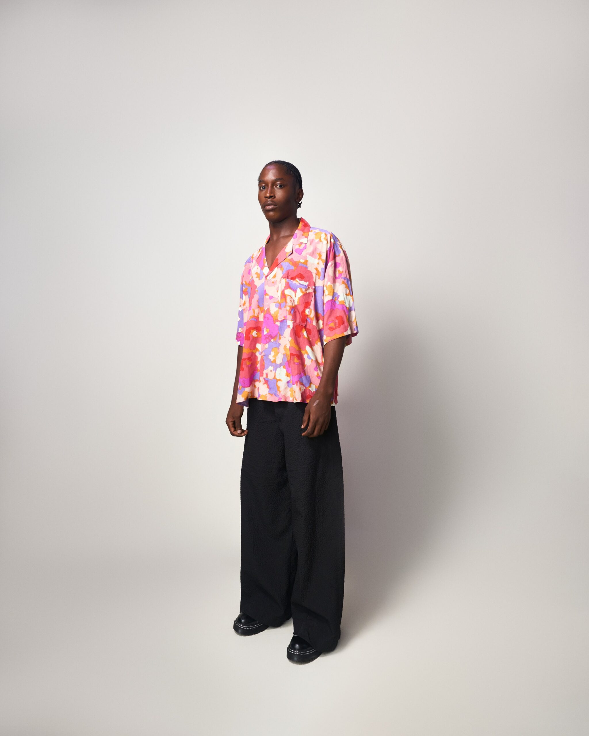 A relaxed camp shirt cut in a vibrant bloom print. Soft, fluid drape with a boxy silhouette and easy short sleeves. Playful colour, softened by a clean, minimal form.