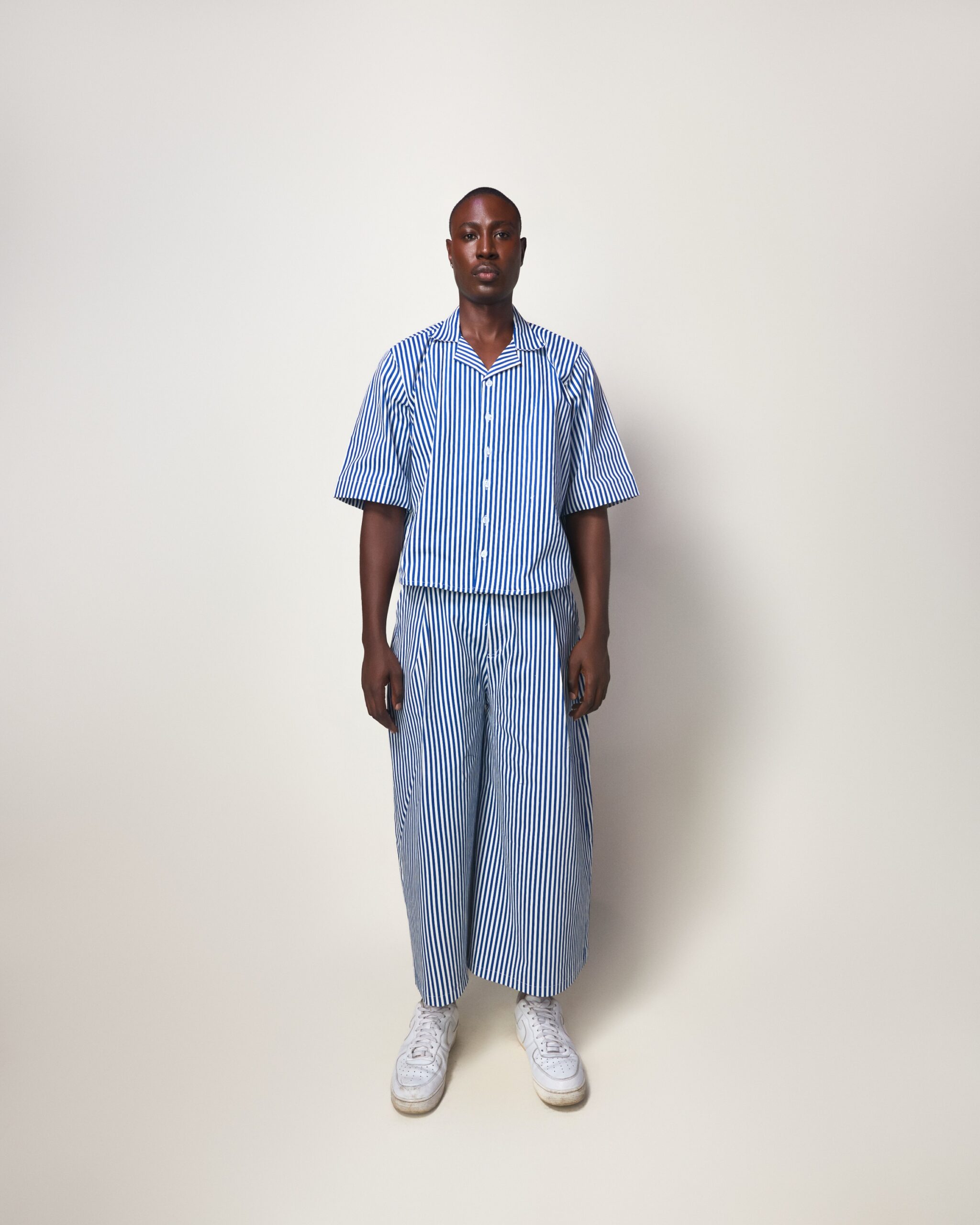 A relaxed short-sleeve camp shirt cut in mid weight striped cotton. Designed with a boxy silhouette, soft collar, and easy drape for everyday wear. Clean, breathable.