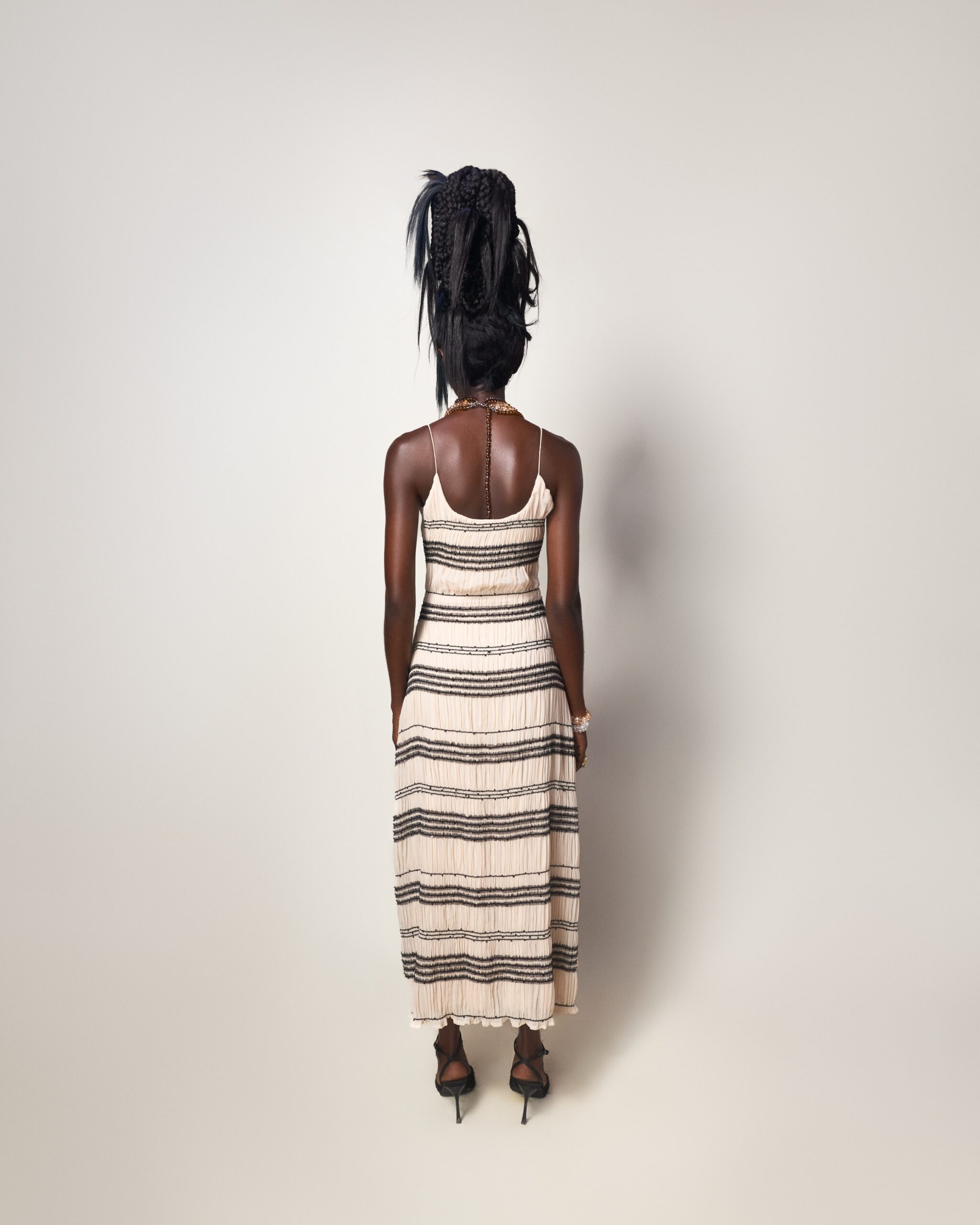A cream maxi dress crafted with soft ripple pleating and horizontal stripe detailing. Designed with slim straps and a relaxed, elongated silhouette. Light, textured, and effortless.